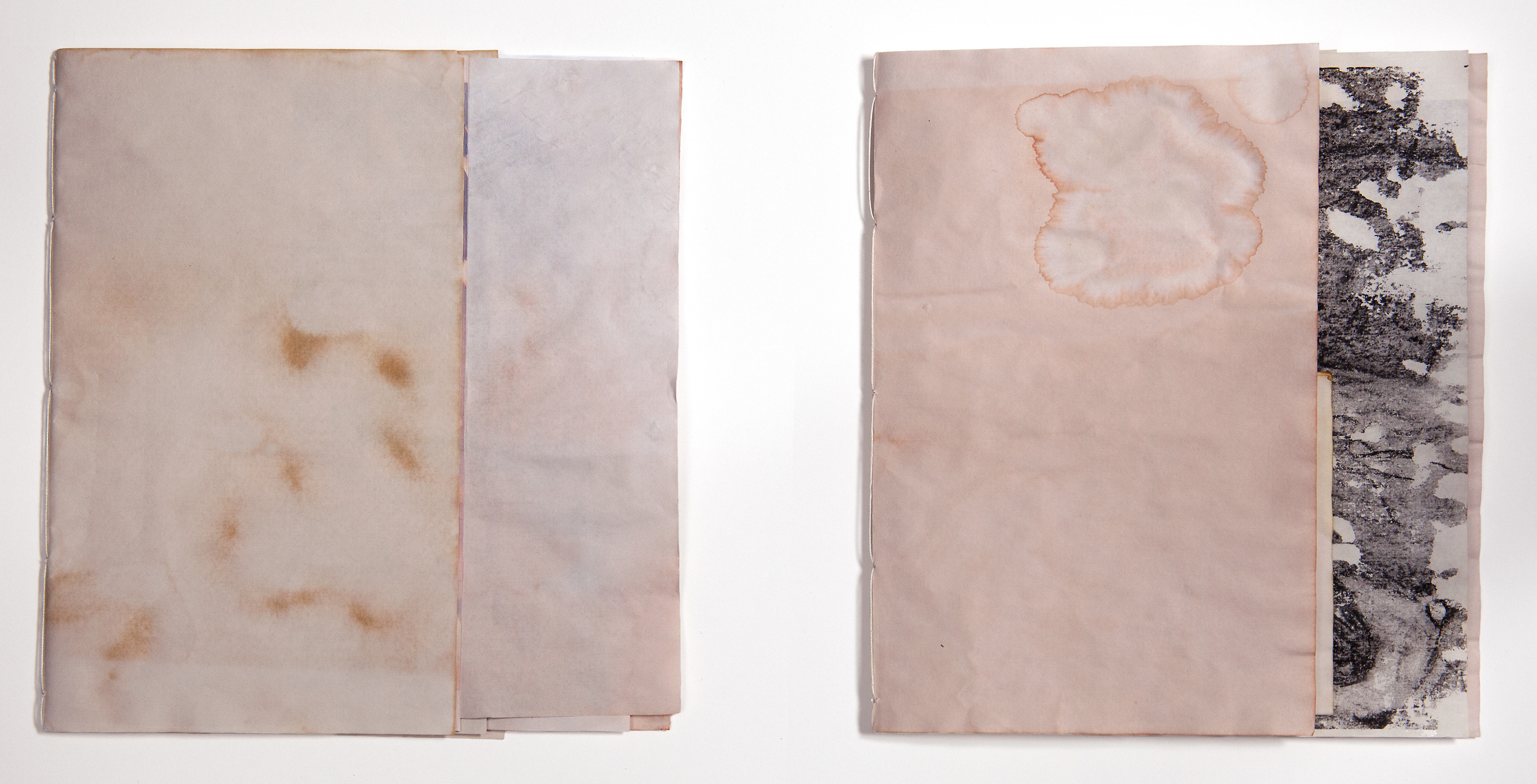 Lockdown Meditations I & II, 2021; Artist book with original poem: Hand-dyed paper, image transfer, inkjet photograph, linen thread, hand sanitizer: each 8.5 x 16 inches (when open)