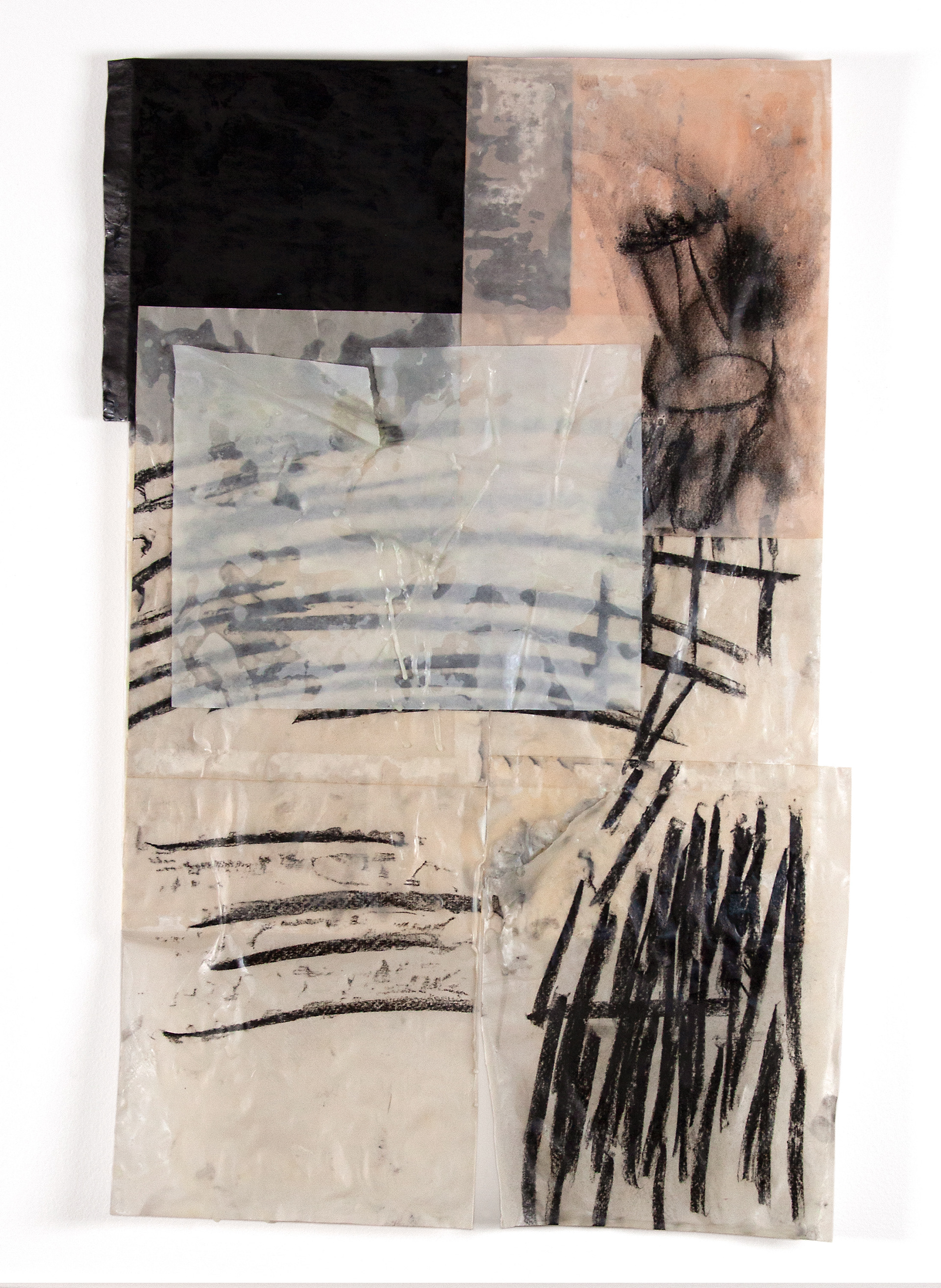 The way the pandemic ripped xyz out of my hands, 2020; Hand-dyed paper, charcoal, hairspray, sumi ink, encaustic paint, encaustic medium on wood panel; 27 x 17 inches