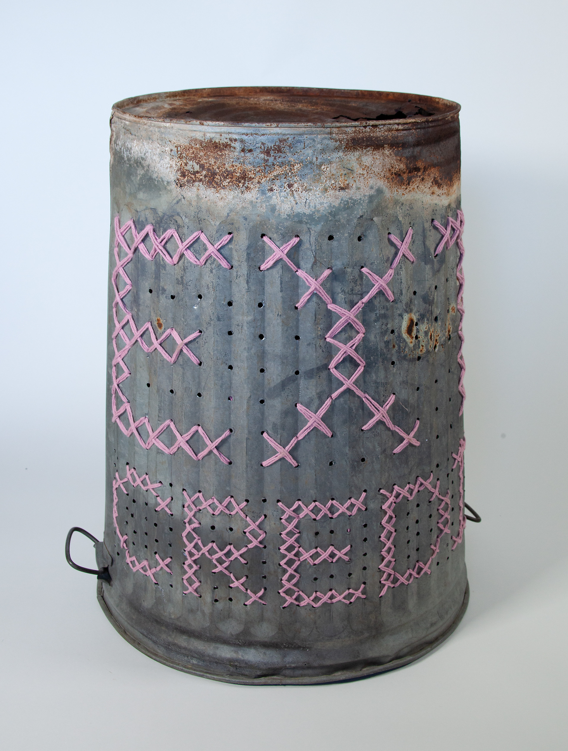 Damaged Receptacle, 2023, metal garbage can, yarn spelling "Extra Credit," 27 x 21 x 21 inches