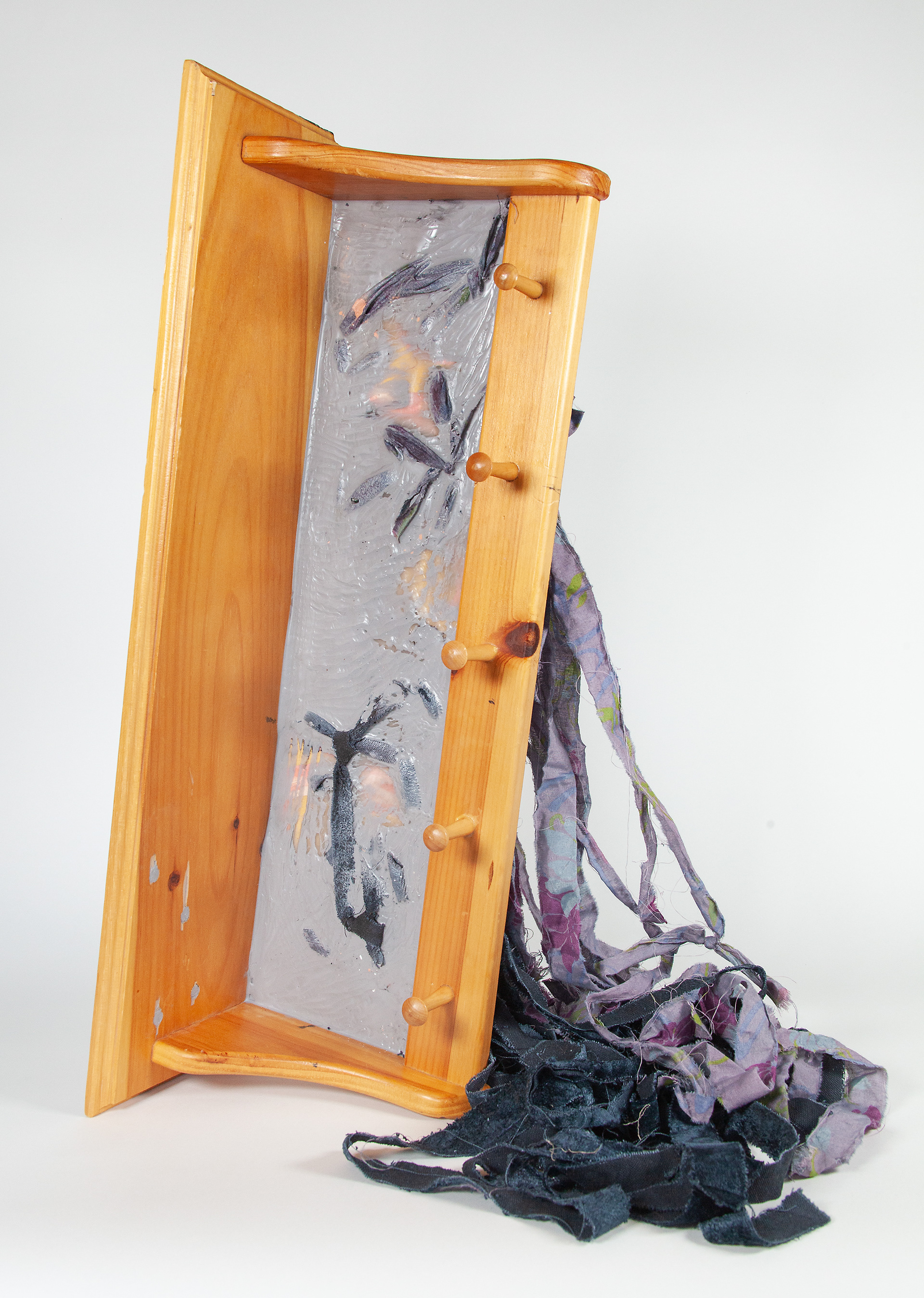 When a name dies, 2023; wooden shelf, torn bedsheet, torn upholstery fabric, encaustic wax, cotton thread, sumi ink, fabric dye; 29 x 18 x 14 inches (depending on install)